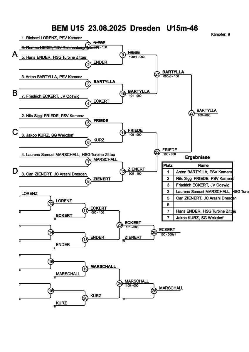 Am Samstag, den 23. August 2025, traf sich die Judo-U15 des Bezirks Dresden in der Sporthalle Weixdorf zur Bezirkseinzelmeisterschaft (BEM). Organisiert wurde das Turnier von der SG Weixdorf e.V. in Zusammenarbeit mit dem Judo-Verband Sachsen. Auf drei Matten wurde ab 10:00 Uhr in Doppel-KO- und Pool-Systemen um Medaillen und die Qualifikation für die Landeseinzelmeisterschaften (LEM) gekämpft.